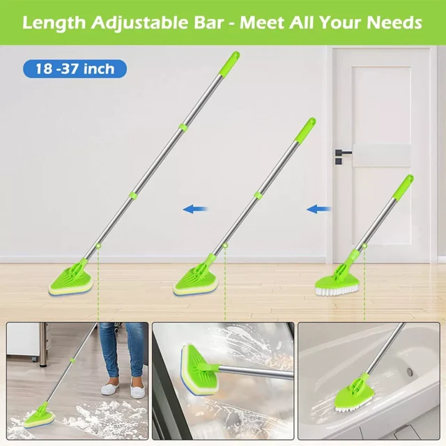 Cleaning hard-to-reach places is no longer a hassle. The telescopic handle extends from 18 inches to 37 inches, allowing you to clean high walls, deep tubs, and narrow crevices without bending, kneeling, or squatting. Simply rotate each section clockwise to lock it in place and enjoy a more comfortable cleaning experience.