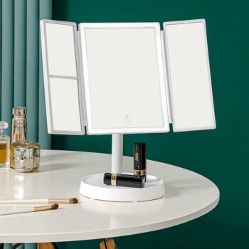 Tri-Fold LED Vanity Mirror with 3 Tone Light, Magnification, and 360° Rotation
