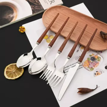 Brown Silver Flatware Set with Imitation Wooden Handles