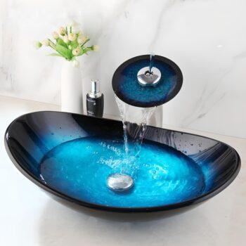 Tempered Glass Waterfall Faucet Oval Basin with Drain Pipe
