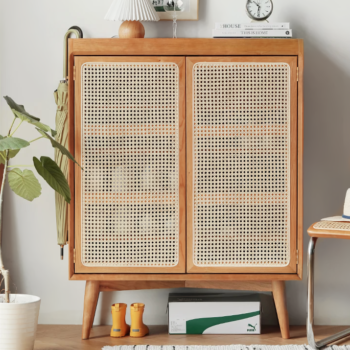 Large Capacity White Oak & Rattan Woven Shoe Cabinet
