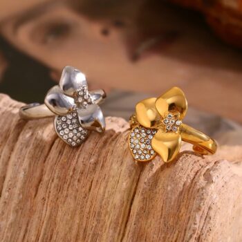 Asymmetric Rhinestone Flower Ring Silver Color Stainless Steel Waterproof Ring for Women